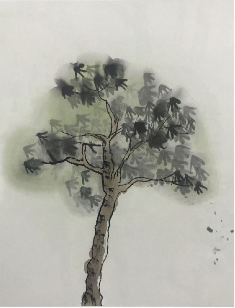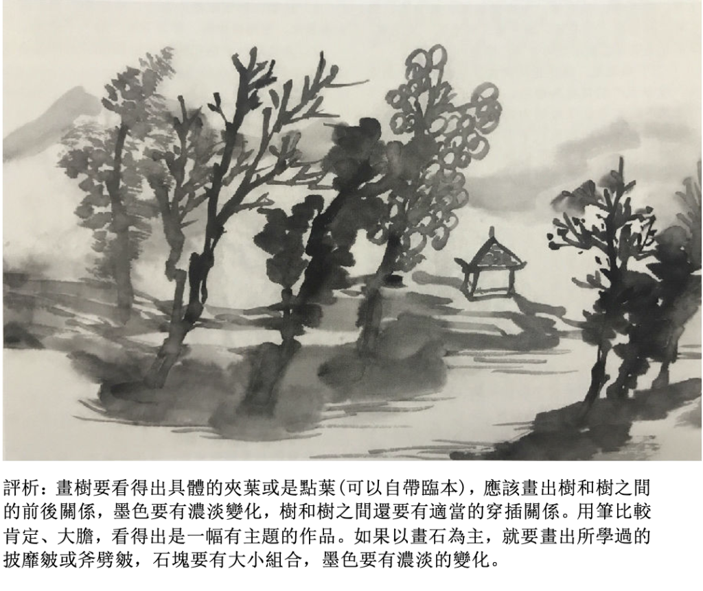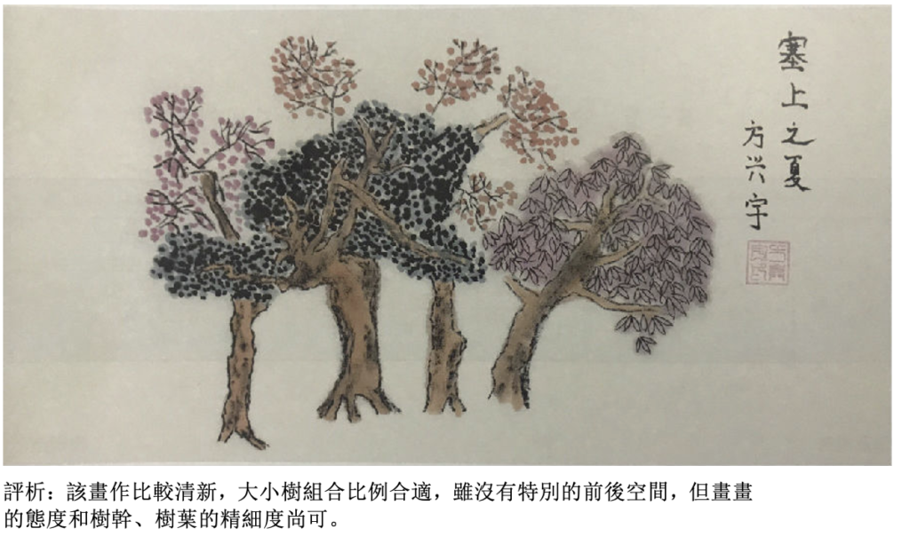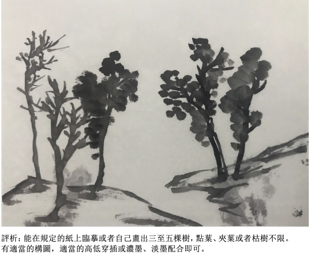 評析:能在規定的紙上臨摹或者自己畫出三至五棵樹,點葉、夾葉或者枯樹不限。有適當的構圖,適當的高低穿插或濃墨、淡墨配合即可。