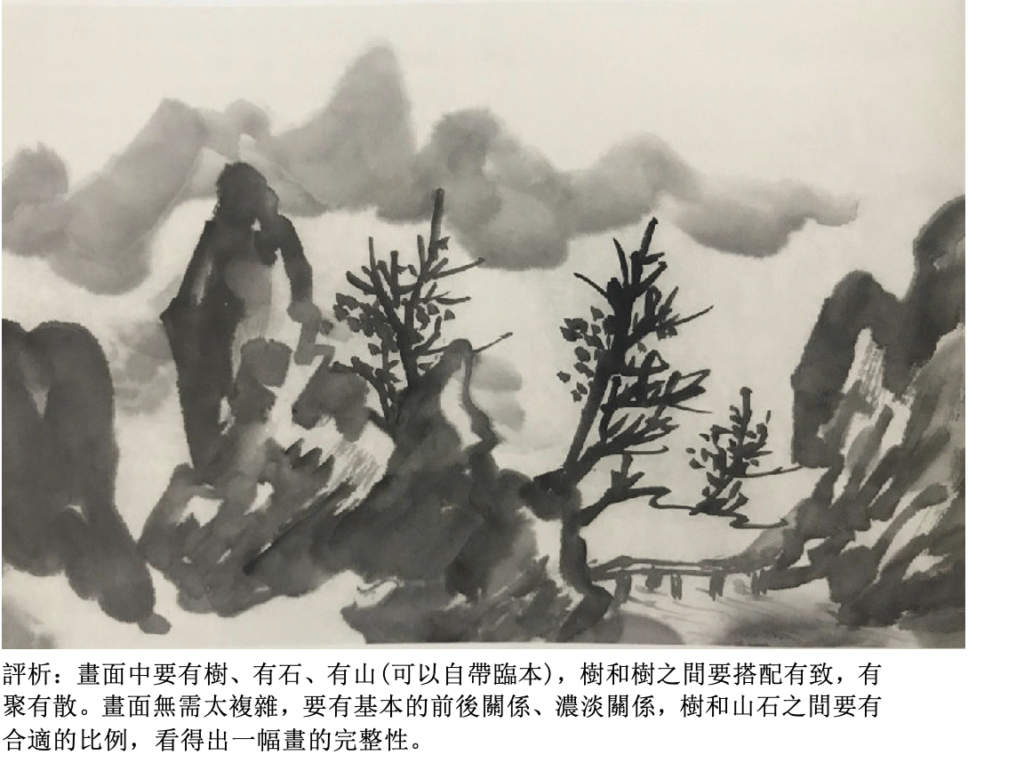 • 中級(四至六級):進階至樹石組合與雲水畫法。四級臨摹三棵以上樹木並配簡單景;五級臨摹一組石塊,學習勾、皴、點、染等技法;六級臨摹樹石小景,加入雲水畫法,筆墨基礎進一步鞏固。