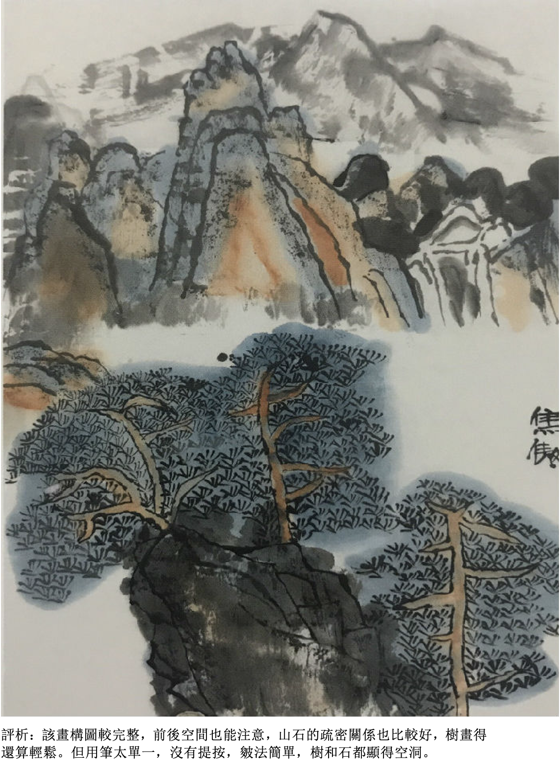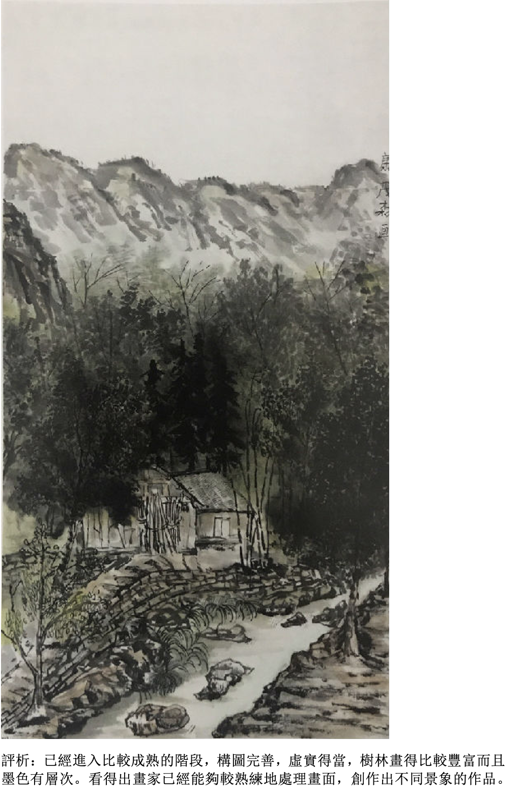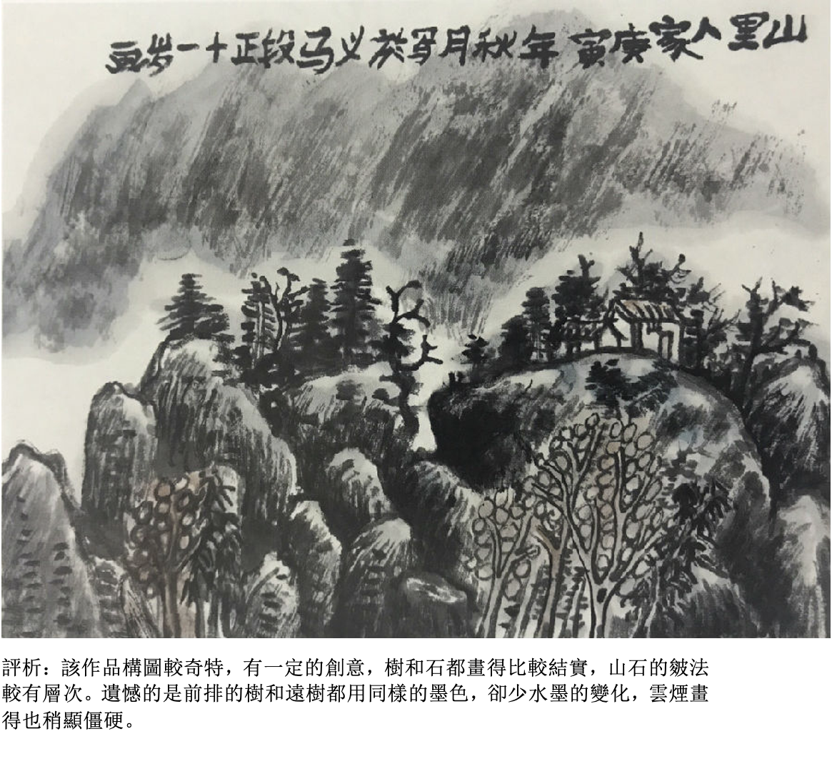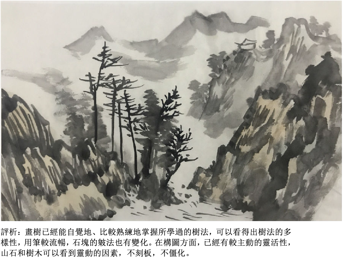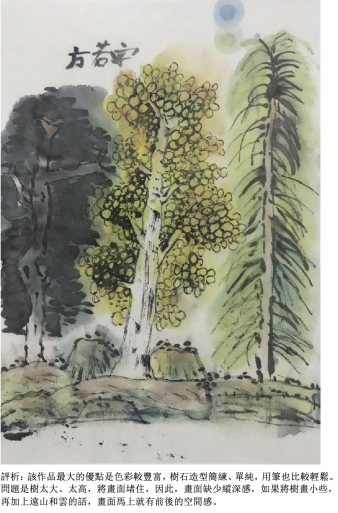 評析:畫樹要看得出具體的夾葉或是點葉(可以自帶臨本),應該畫出樹和樹之間的前後關係,墨色要有濃淡變化,樹和樹之間還要有適當的穿插關係。用筆比較肯定、大膽,看得出是一幅有主題的作品。如果以畫石為主,就要畫出所學過的披靡皴或斧劈皴,石塊要有大小組合,墨色要有濃淡的變化。