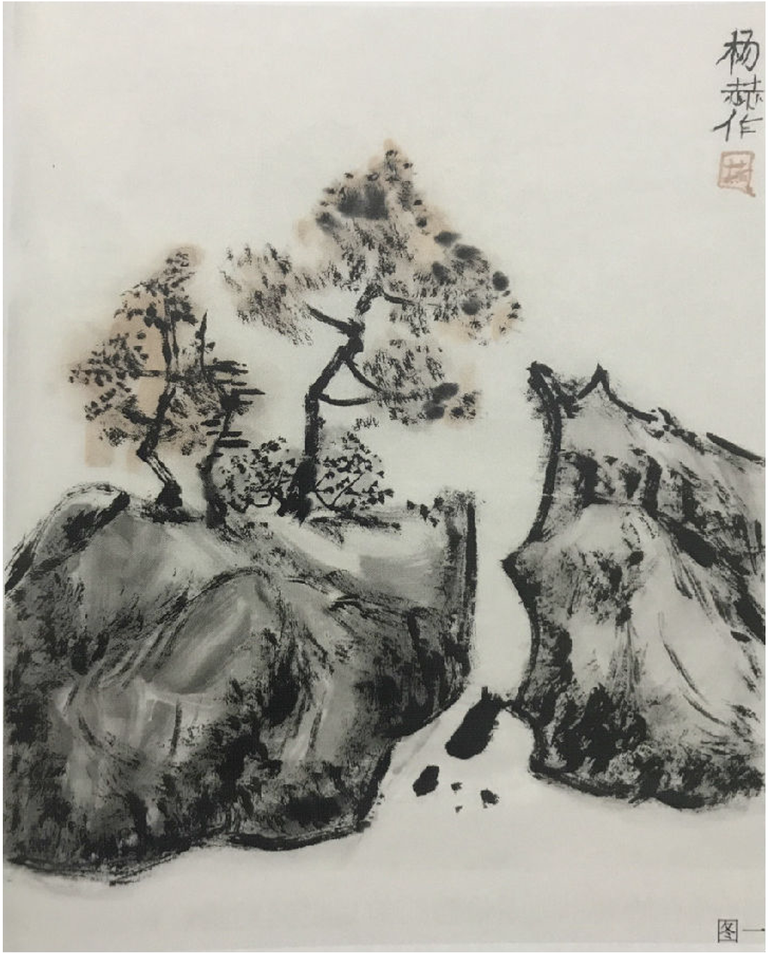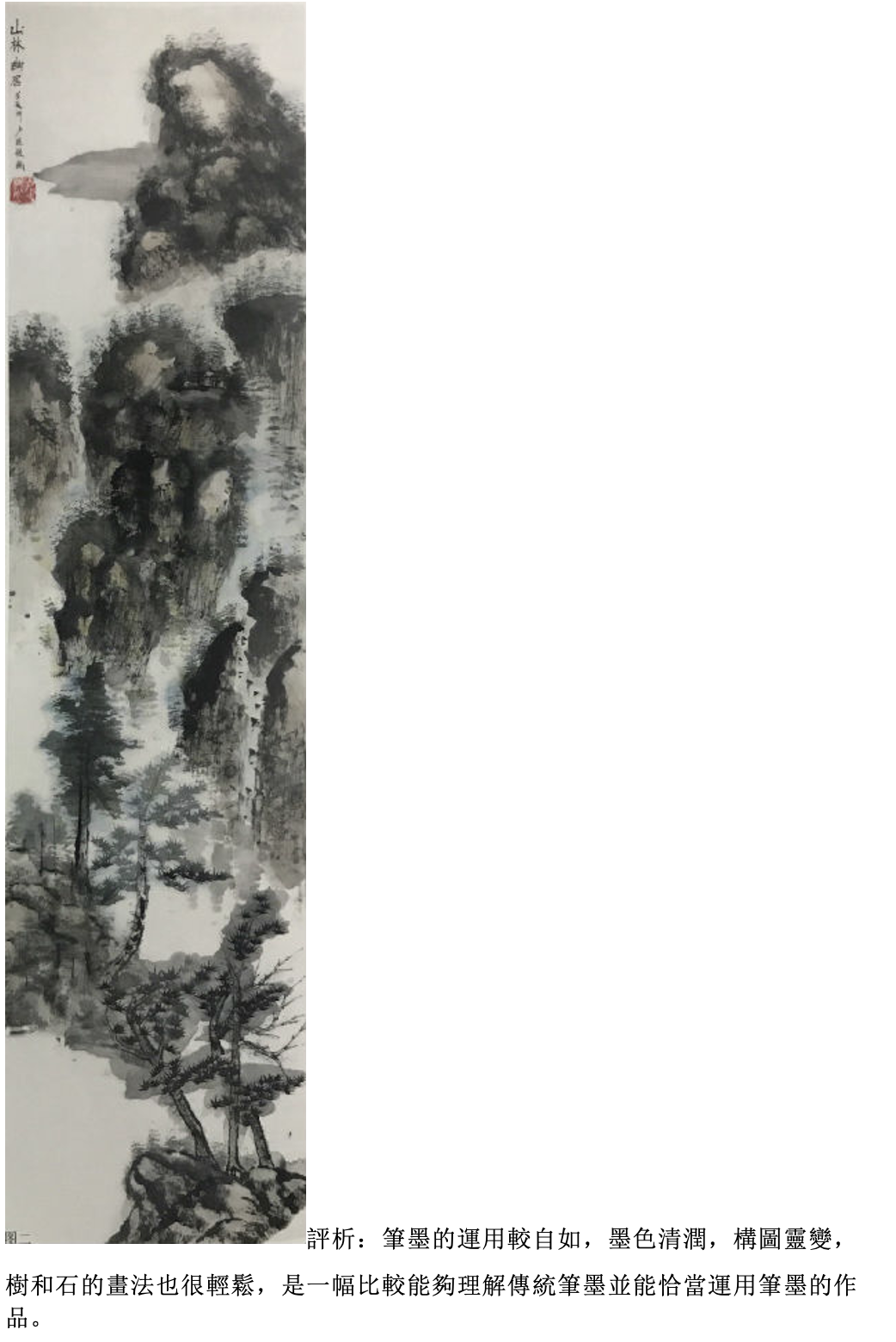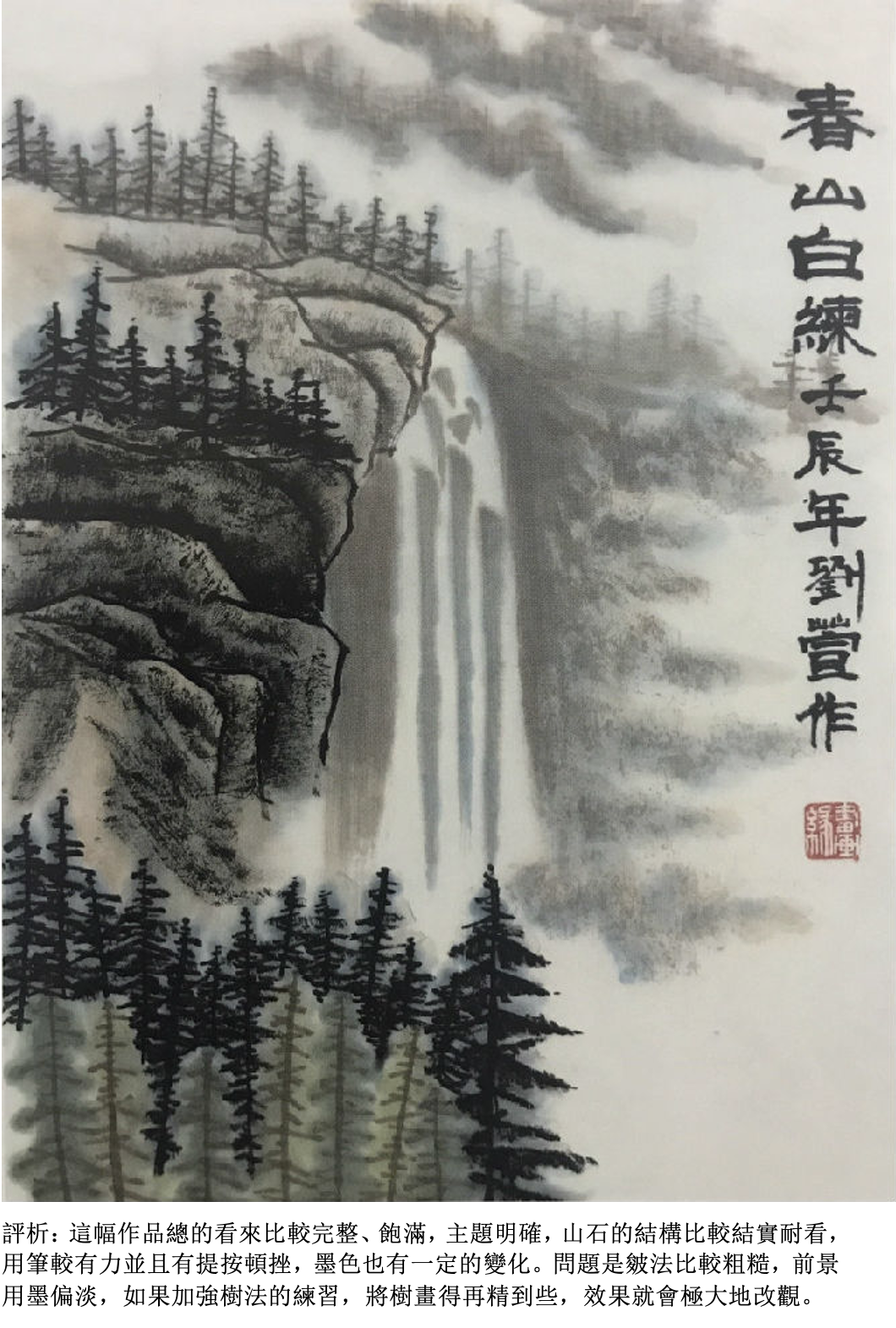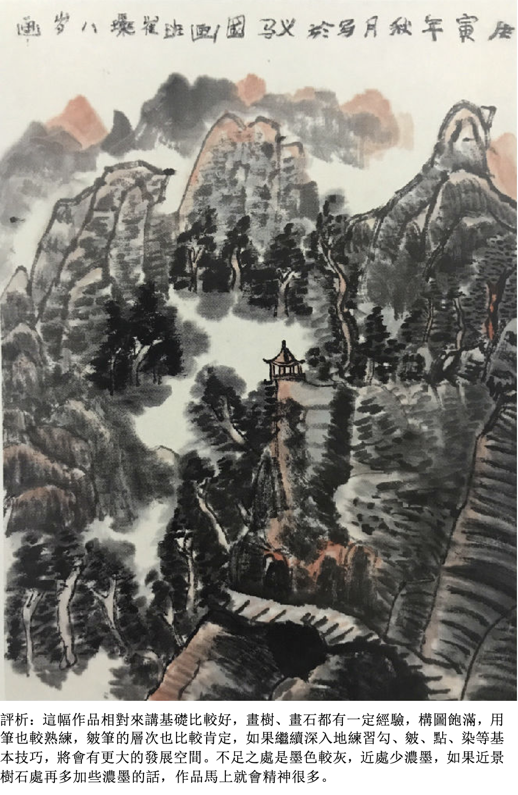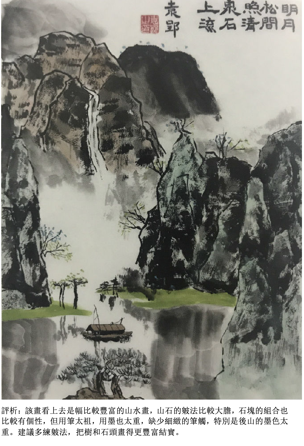 評析:畫樹要看得出具體的夾葉或是點葉(可以自帶臨本),應該畫出樹和樹之間的前後關係,墨色要有濃淡變化,樹和樹之間還要有適當的穿插關係。用筆比較肯定、大膽,看得出是一幅有主題的作品。如果以畫石為主,就要畫出所學過的披靡皴或斧劈皴,石塊要有大小組合,墨色要有濃淡的變化。