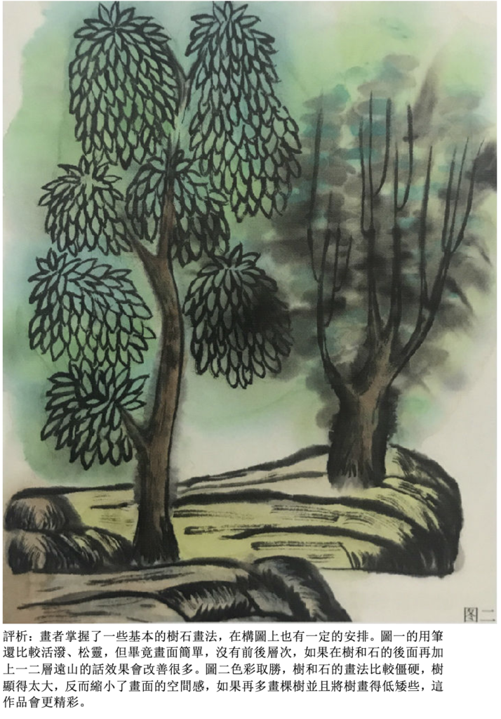 評析:該兩幅作品基本能將樹幹和葉子都畫齊,比例得當,樹之造型不難看,墨色也比較透氣,用筆雖然比較稚嫩,但還算是較認真的作品。