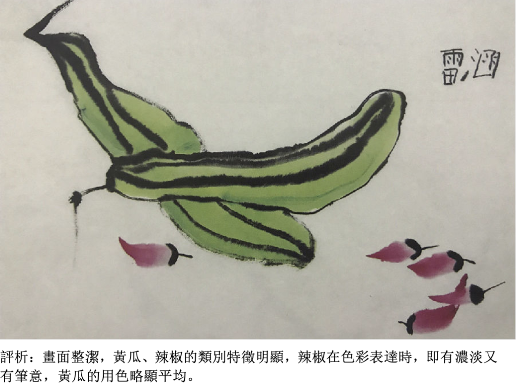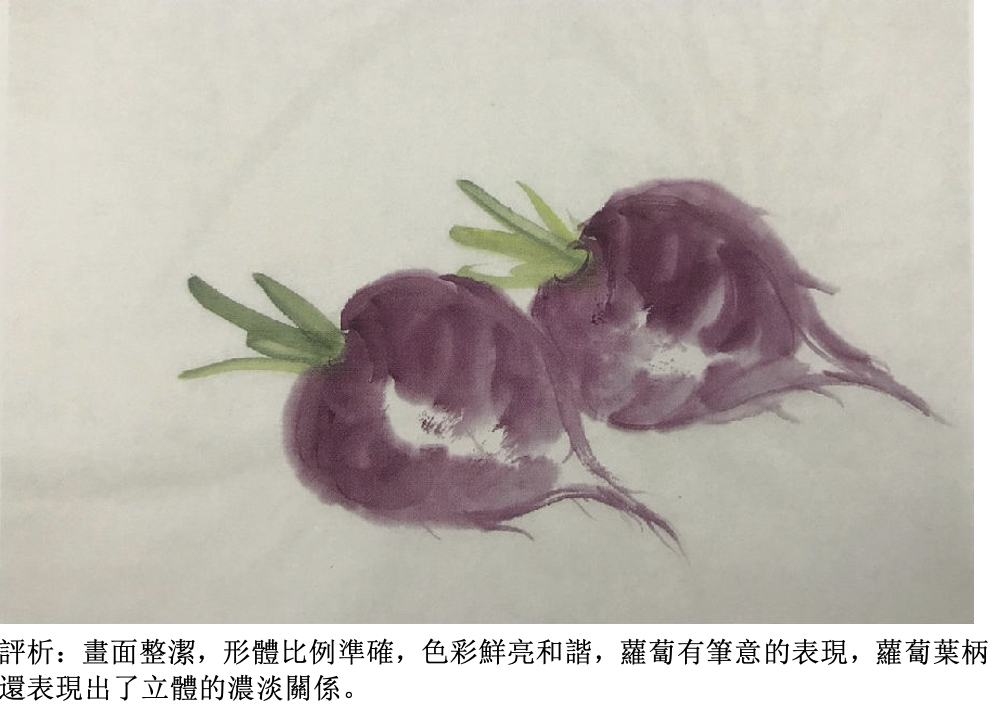初級一級90 分鐘四尺六開自選素材,進行中國畫墨分五色及用色的層次表現。 (素材內容不限,可以以範本中的蔬果、石頭、簡筆人物為依據,亦可自行選材。 ) 要求:水墨或設色1畫面整潔 2素材造型不限。 3素材表現要有墨色或色彩的層次變化。