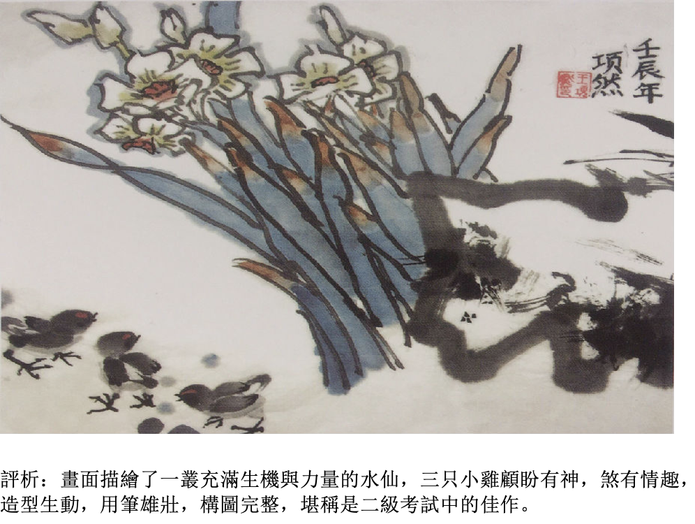 • 中級(四至六級):進階至花卉、禽鳥的組合默寫與完整構圖。四級自選梅、蘭、竹、菊、禽鳥中的兩種素材默寫,須落款;五級自選牡丹、荷花、燕子、石頭等兩種題材組合默寫;六級選取同一季節的兩種植物進行默寫,要求主次分明、設色雅致。
