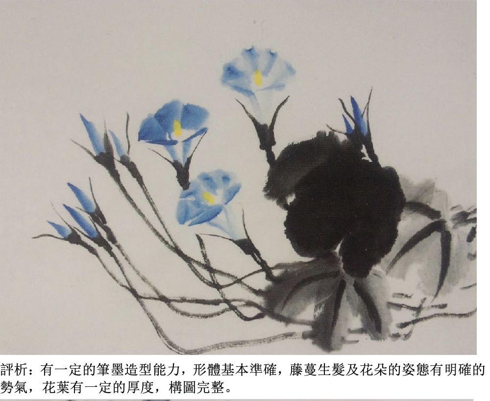 • 初級(一至三級):重點在於認識工具材料與基本筆墨表現。一級要求表現墨分五色或設色層次;二級強調提按頓挫的書法筆意;三級需結合墨色與筆意,表現春、夏、秋、冬其中一個季節的特色。