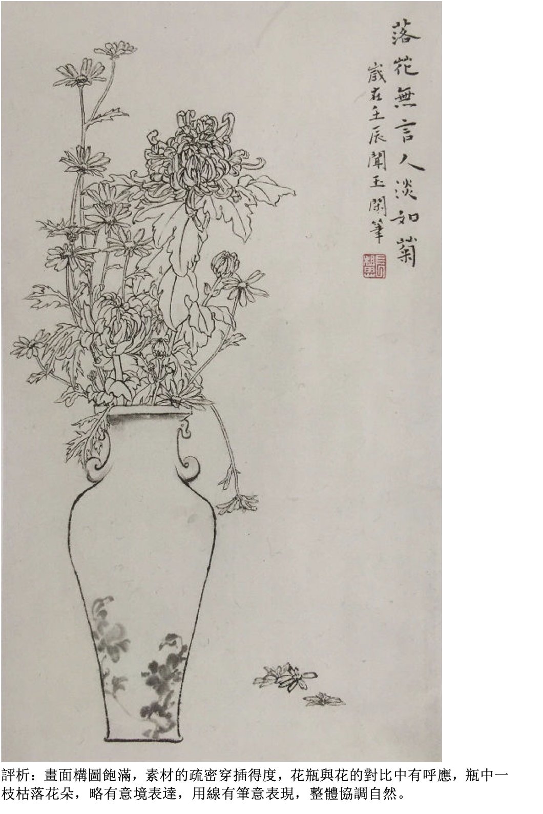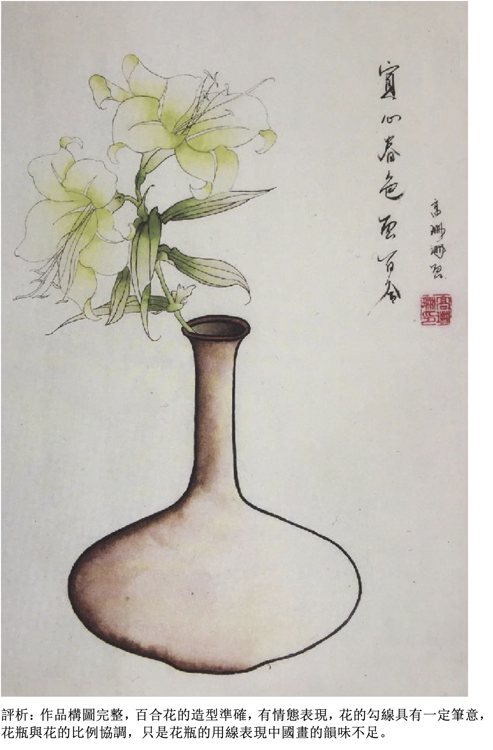 九級150 分鐘四尺三開折枝花卉(瓶花)白描寫生。 要求:鉛筆稿和毛筆正稿皆上交,可以施淡彩,畫面須題跋,內容自擬。1造型生動。 2構圖完整層次清晰。 3線條流暢,富有變化。設色淡雅。