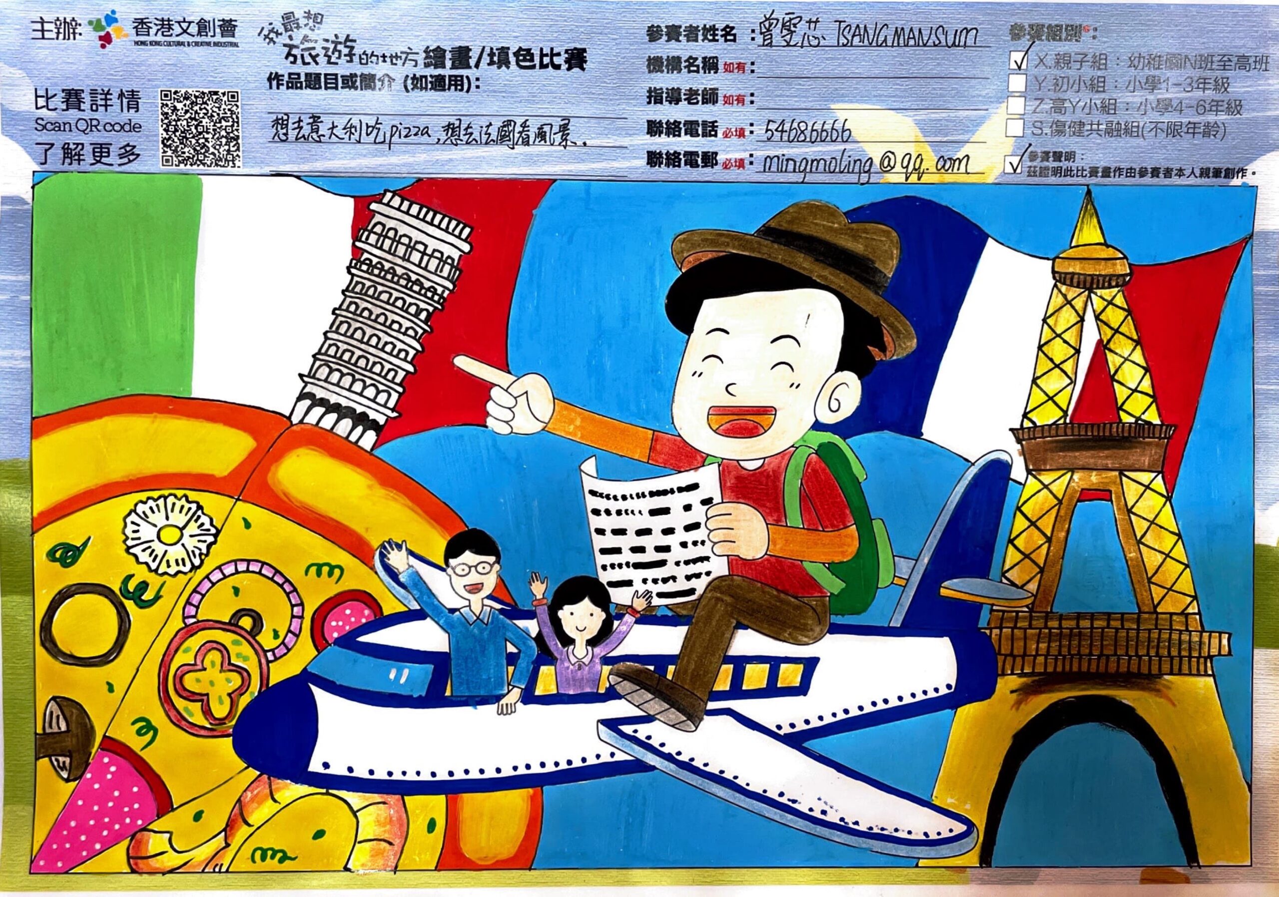我最想旅遊的地方繪畫及填色比賽是一個面向兒童和青少年的創意比賽,旨在通過繪畫和填色活動,讓參賽者展現對自己最向往的旅遊 目的地的想像和創意。參賽者可以選擇自己最喜歡的旅遊目的地,無論是國內還是國外,城市還是自然景點,都可以成為創作的靈感來 源。參賽者可以用自己的創意和想像力,繪製出目的地的風景、建築、人物等等,展現自己對這個地方的獨特理解和表達。比賽也希望 能夠通過這個主題,啟發參賽者對不同地域和文化的了解和欣賞,培養他們對旅遊和世界的開放心態和好奇心。