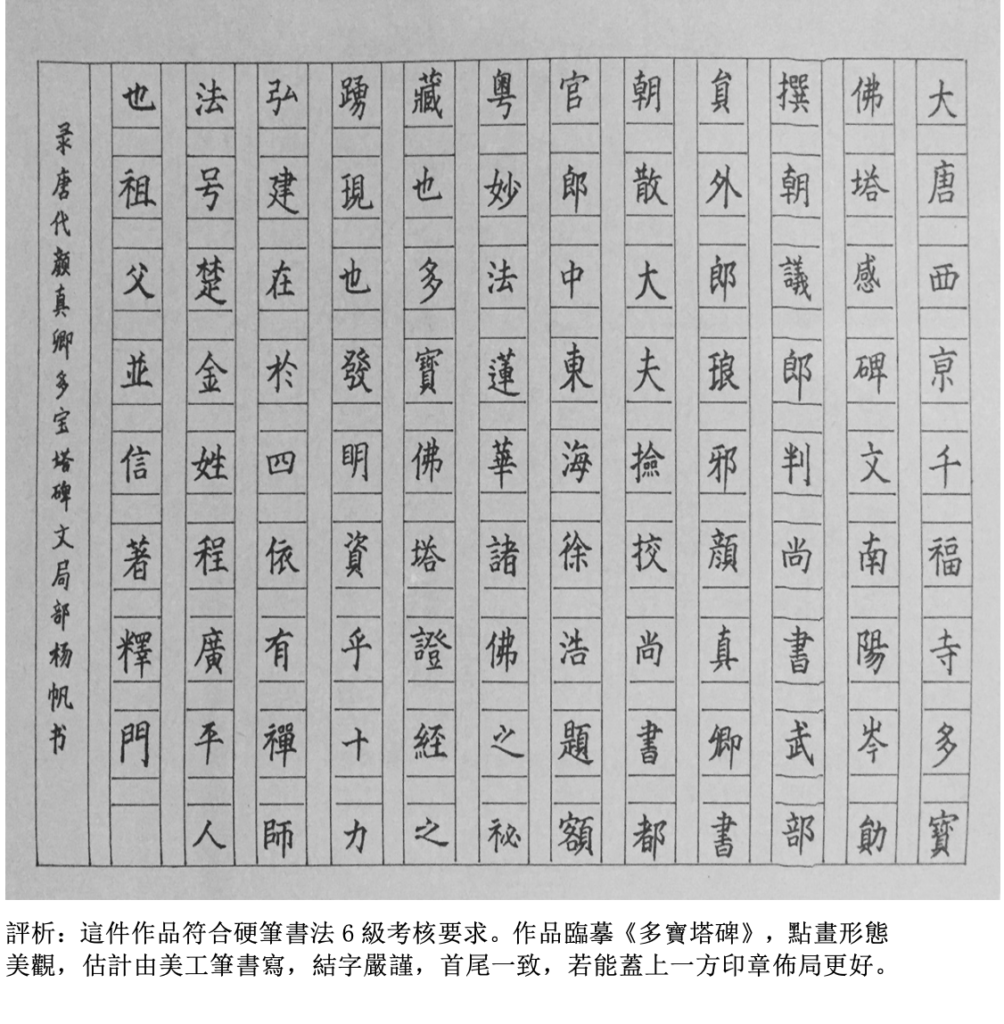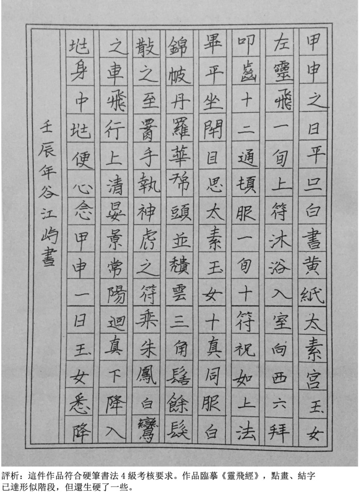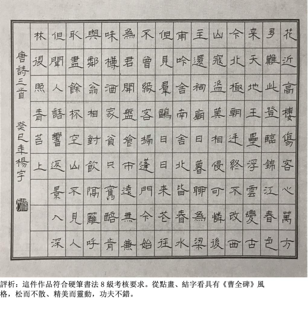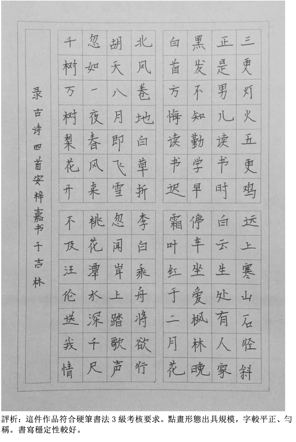| 中級 .臨摹至創作過渡階段 | 四級 | 90 分鐘 | 八開 | 1臨摹自選小楷名帖一種,用鋼筆。四級以下必須用鋼筆。 2不少於 100 字。 | 1寫字水平:多為有兩年學書之功,臨帖已達形似階段,對古代優秀字帖有一定的學習。 2評定重點:筆劃、結體。 3評定參考: 1、筆劃:點畫形態較好。 2、結體:字體較為端穩美觀,毛病不多。 3、章法:基本正確。 |