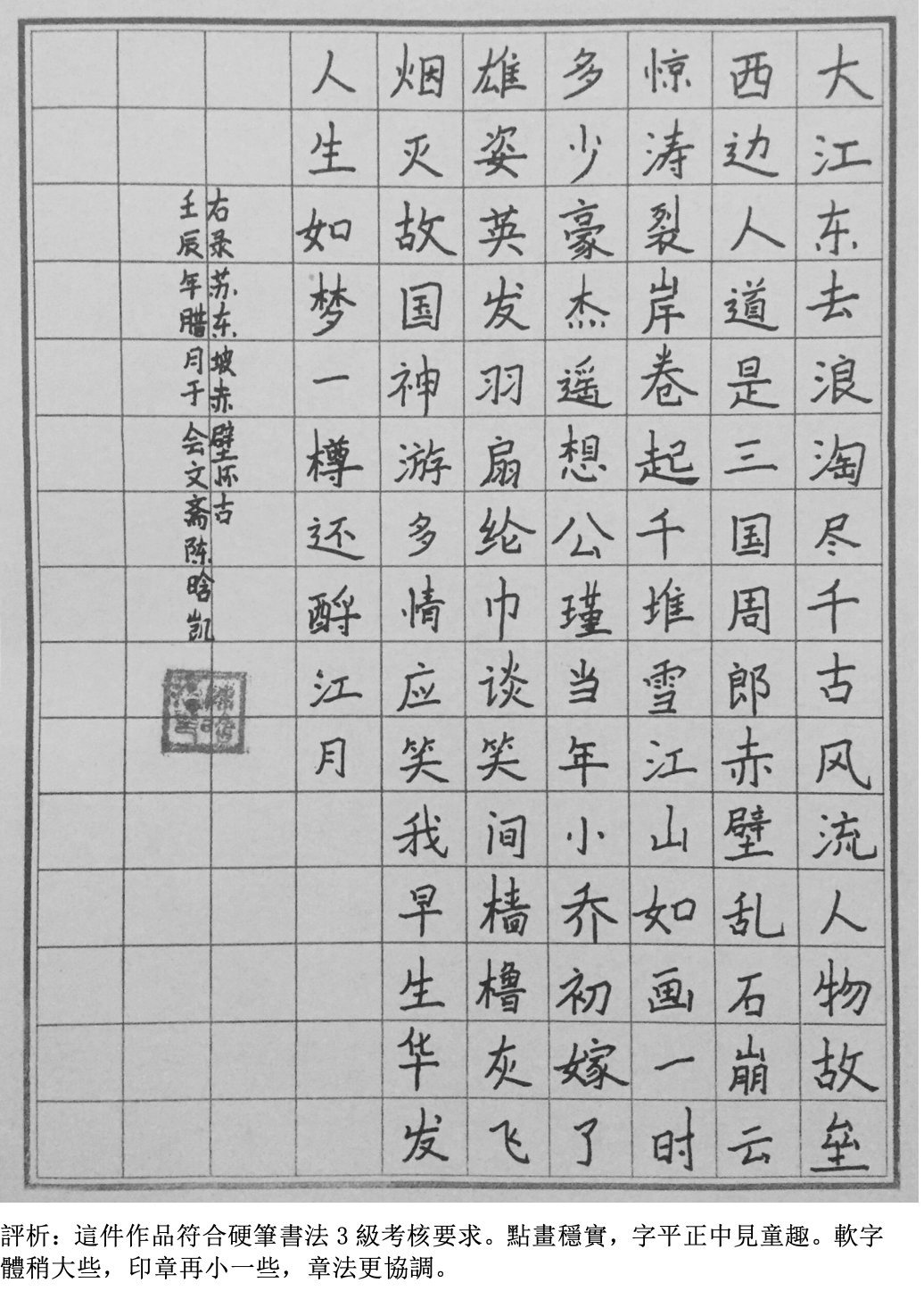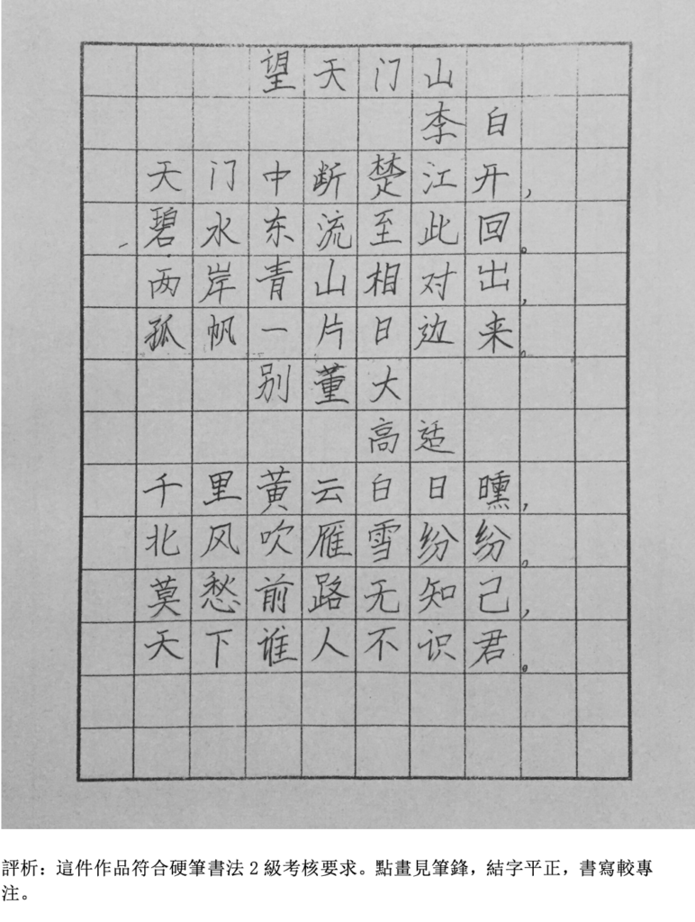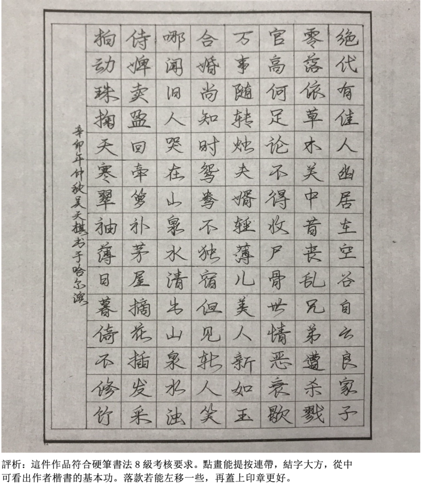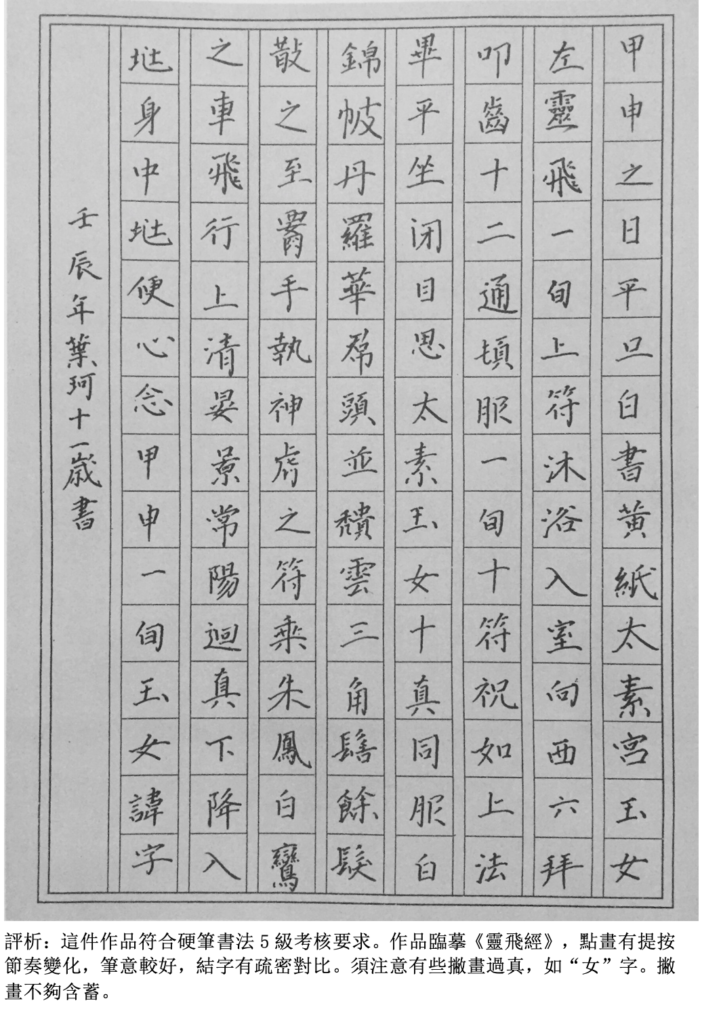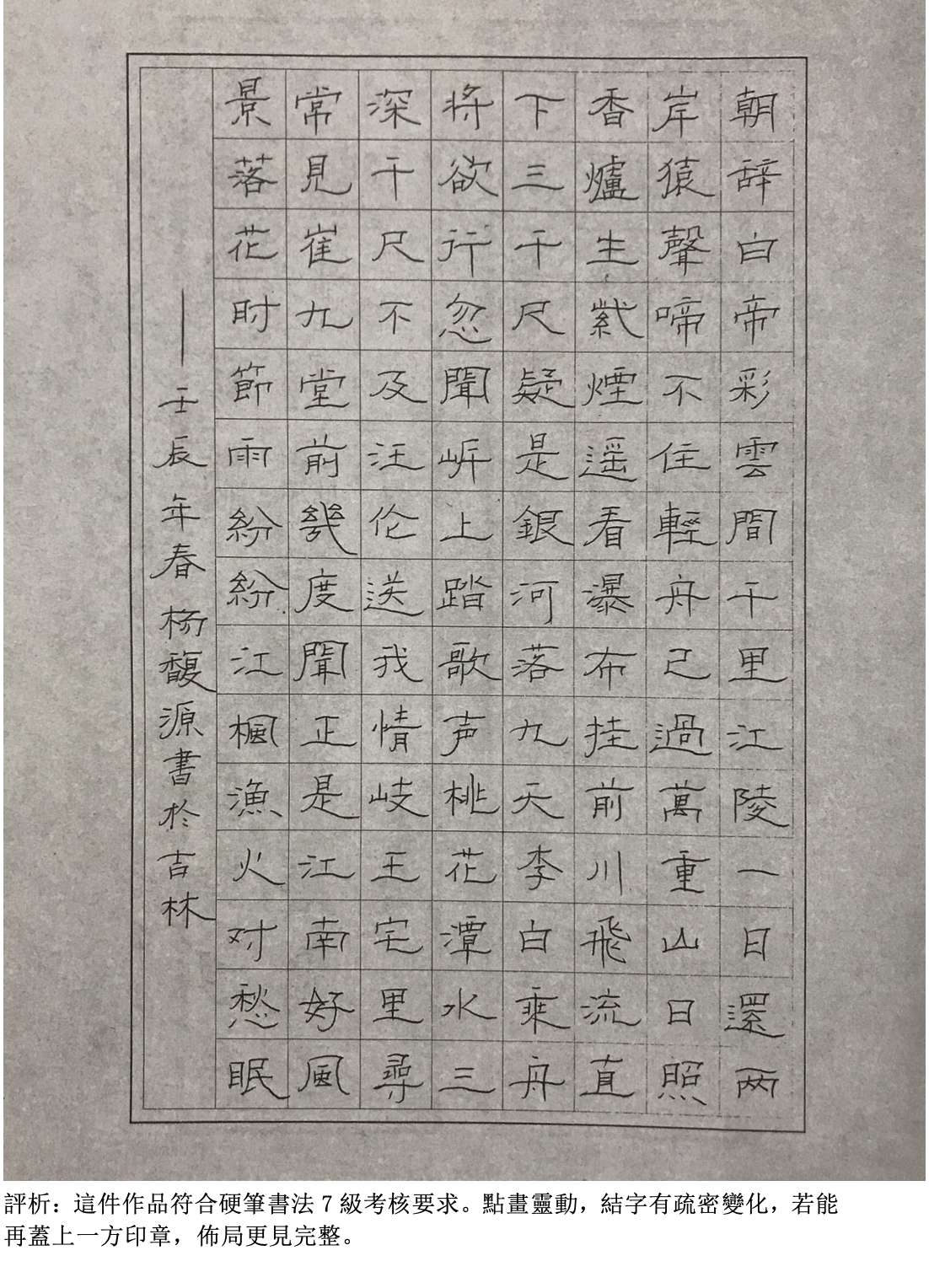 | 中級 .臨摹至創作過渡階段 | 四級 | 90 分鐘 | 八開 | 1臨摹自選小楷名帖一種,用鋼筆。四級以下必須用鋼筆。 2不少於 100 字。 | 1寫字水平:多為有兩年學書之功,臨帖已達形似階段,對古代優秀字帖有一定的學習。 2評定重點:筆劃、結體。 3評定參考: 1、筆劃:點畫形態較好。 2、結體:字體較為端穩美觀,毛病不多。 3、章法:基本正確。 |