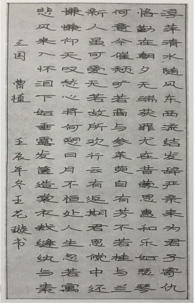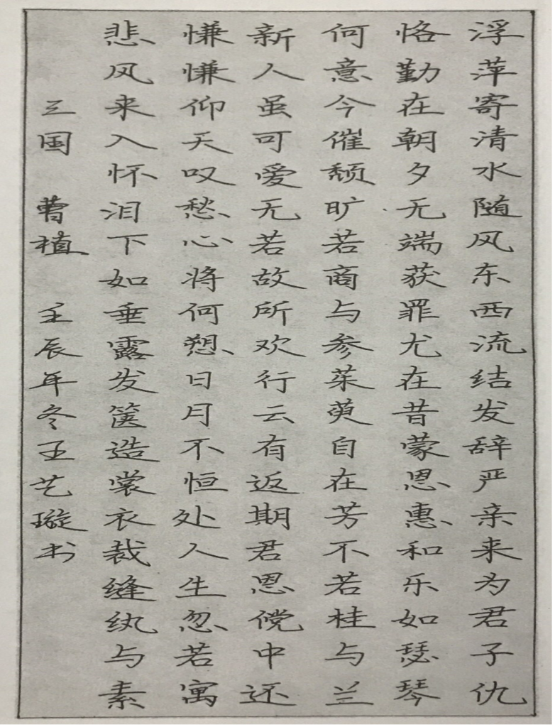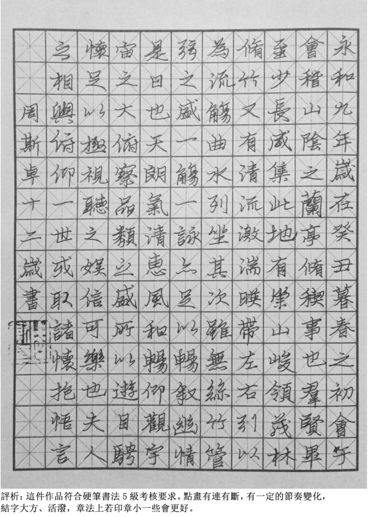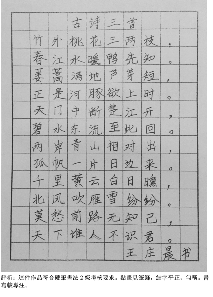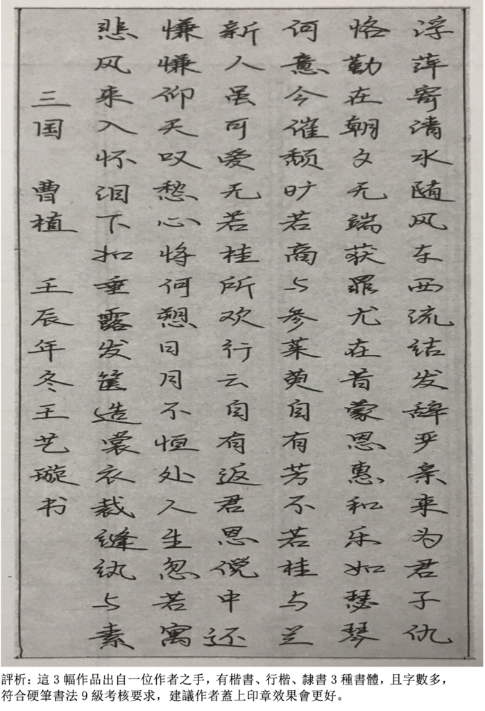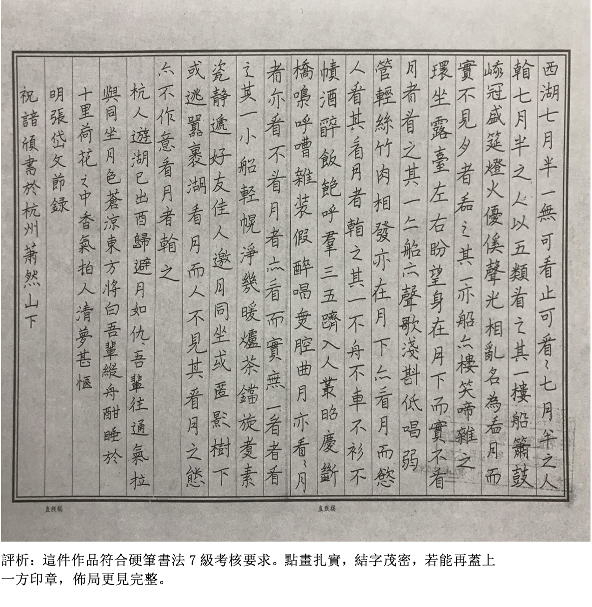 | 中級 .臨摹至創作過渡階段 | 四級 | 90 分鐘 | 八開 | 1臨摹自選小楷名帖一種,用鋼筆。四級以下必須用鋼筆。 2不少於 100 字。 | 1寫字水平:多為有兩年學書之功,臨帖已達形似階段,對古代優秀字帖有一定的學習。 2評定重點:筆劃、結體。 3評定參考: 1、筆劃:點畫形態較好。 2、結體:字體較為端穩美觀,毛病不多。 3、章法:基本正確。 |