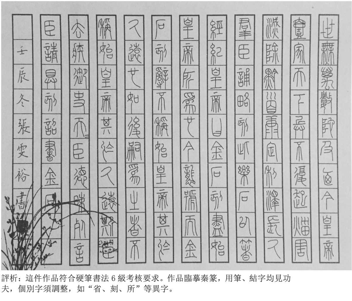 | 五級 | 90 分鐘 | 八開 | 1臨摹兩種古代經典名帖(楷隸二選一、行篆二選一) 2每幅作品不少於50 字。 | 1寫字水平:已有一定功力,臨摹水平較高。 2評定重點:筆劃、結體、章法。 3評定參考: 1、筆劃:點畫形態和質感較好,有一定的節奏變化。 2、結體:結體平正活潑、勻稱、有疏密變化。 3、章法:無明顯毛病。 | |