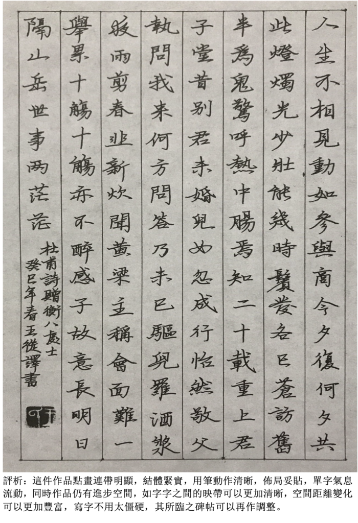 - 優異試卷示範:展示筆劃乾淨有力、結體嚴謹勻稱、章法疏朗有致、創作能體現傳統功底的作品。